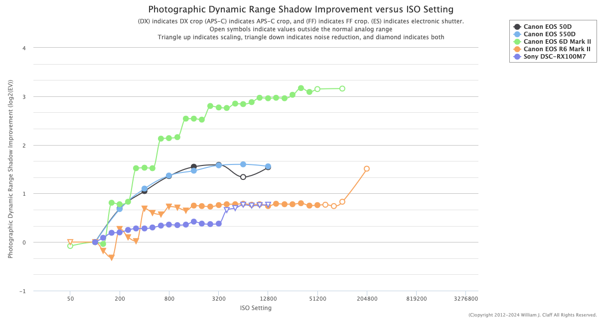 Besonders spannend fand ich die Vergleichsgrafik, die für verschiedene Kameramodelle anzeigt, bei welcher ISO-Stufe es für dunkle Bildbereiche egal ist, ob man sie bei der RAW-Bearbeitung später erhöht oder wann es besser ist, dass die Kamera direkt bei der Aufnahme die richtige ISO-Einstellung haben sollte, da man dunkle Bildbereiche später sonst nicht mehr bzw. nur noch um den Preis sehr starken Rauschens retten kann.